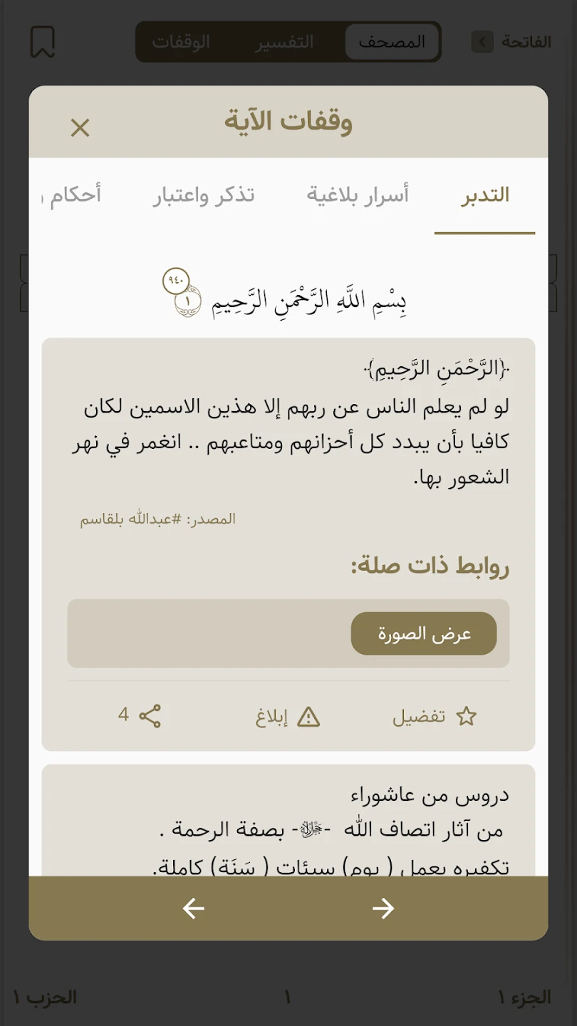 This app offers robust features for individual recitation and translation, with a large community component focused on sharing reflections and insights for personal تدارس. |