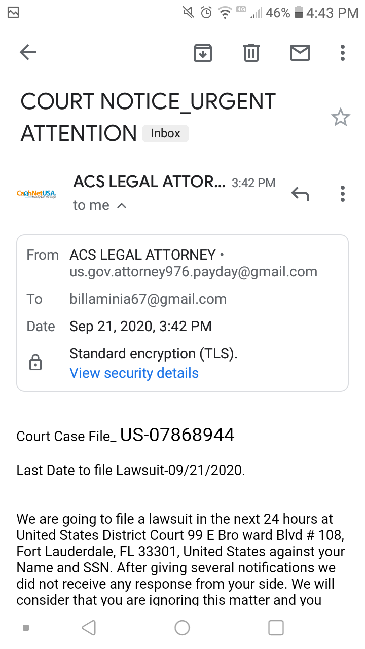 We are going to file a lawsuit in next 24 hours at United States District Court 99 E Broward Blvd # 108, Fort Lauderdale, FL 33301, United States against your Name and SSN. After giving several notifications we did not received any response from your side. We will consider that you are ignoring this matter and you want to dispute. We are in a process to inform the Social Security Administration & major Credit Bureaus as well.This is our last warning to you; kindly update us ASAP so that we can proceed.