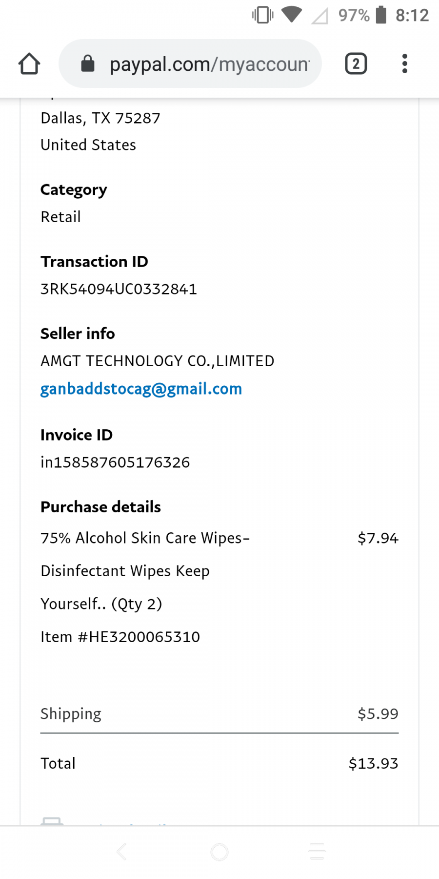 On April 2, 2020 I placed an order with AMGT Technology CO., Limited. I did not receive a tracking number. It was a total of $13.93 for sanitary wipes. I paid through PayPal. I filed a complaint with PayPal on May 3, after I emailed the seller. The seller sent me a fake tracking number. Today PayPal told me I would not receive my refund not the product. This company is a scam and please do not use them!