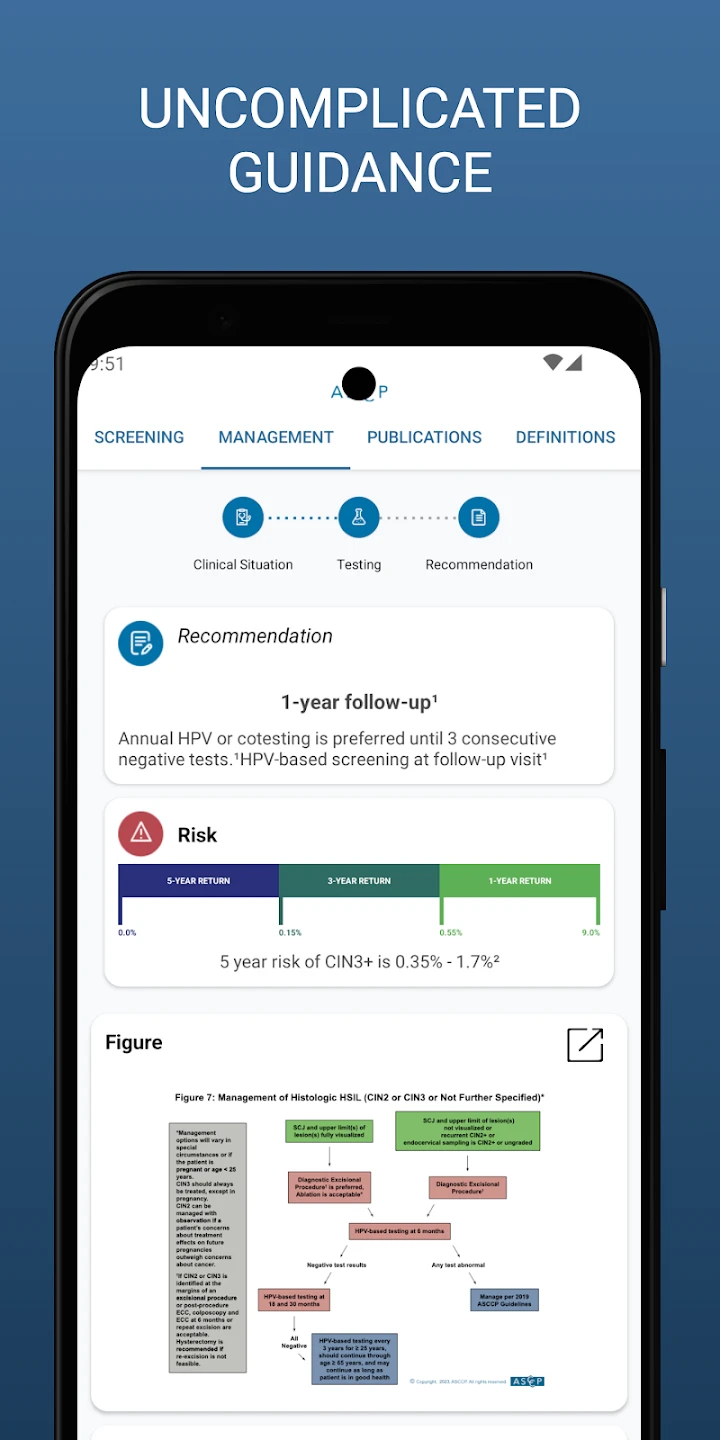 • Latest Version Synchronization: The app checks and updates itself when new official ASCCP Management Guidelines are published, ensuring users always have the most current clinical recommendations at their fingertips, eliminating the need to manually seek out updates.