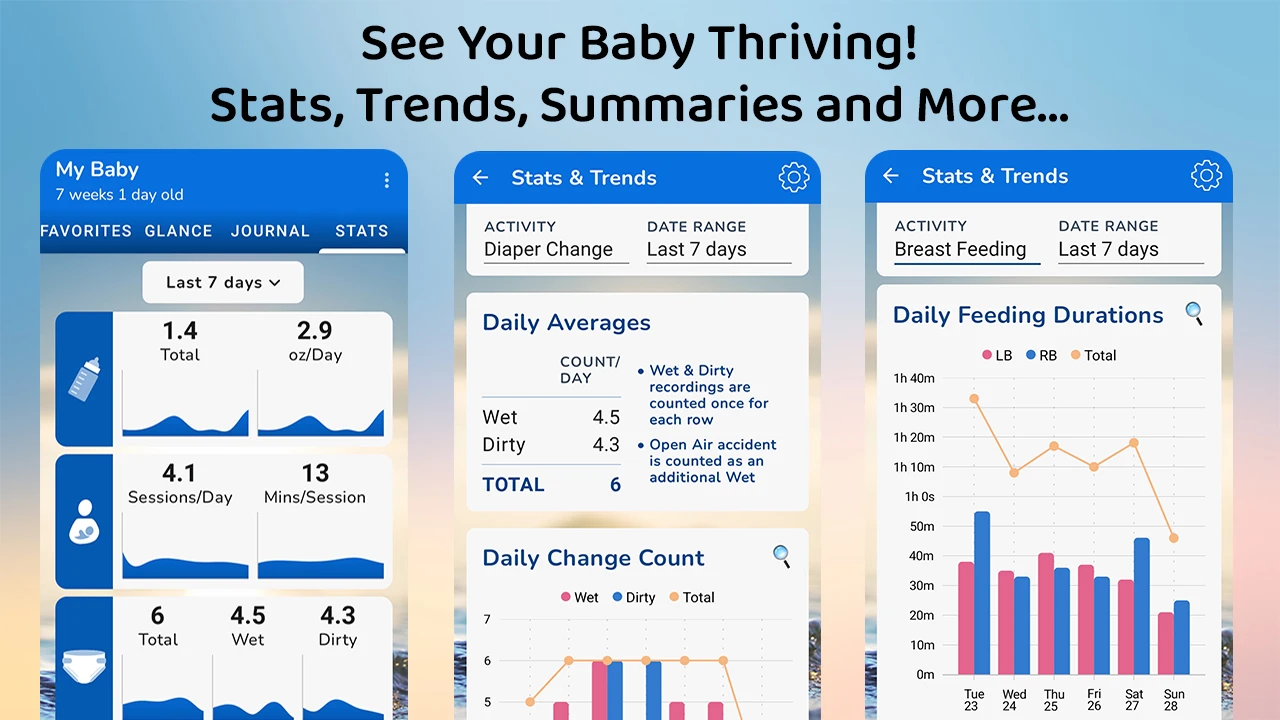 Designed for simplicity and sleep tracking. Includes quick-entry buttons for feed, diaper, sleep, and a focus on baby weight monitoring. |