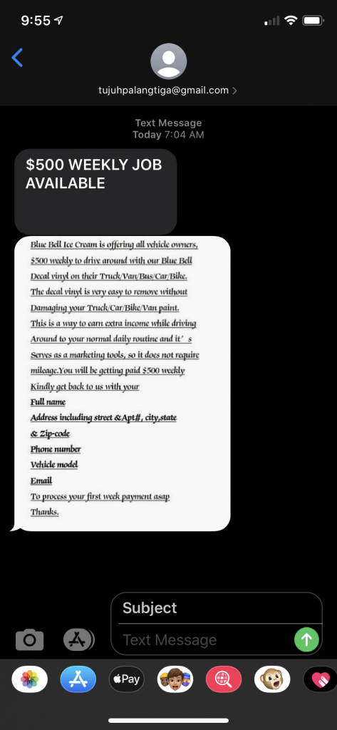 Got a text offering $500 a week for wrapping my car. No body text, sent as a picture only. Asking to give name, address, make of car, etc. Thought it looked sketchy.