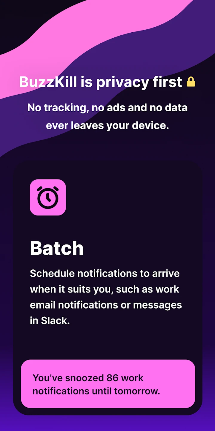 • Sleep-Mode Analytics: Track your digital wellness by monitoring notification suppression habits over time, showing how much screen time and distraction time you’ve eliminated through BuzzKill usage with simple visual charts. This helps users understand the impact of their notification management strategy.