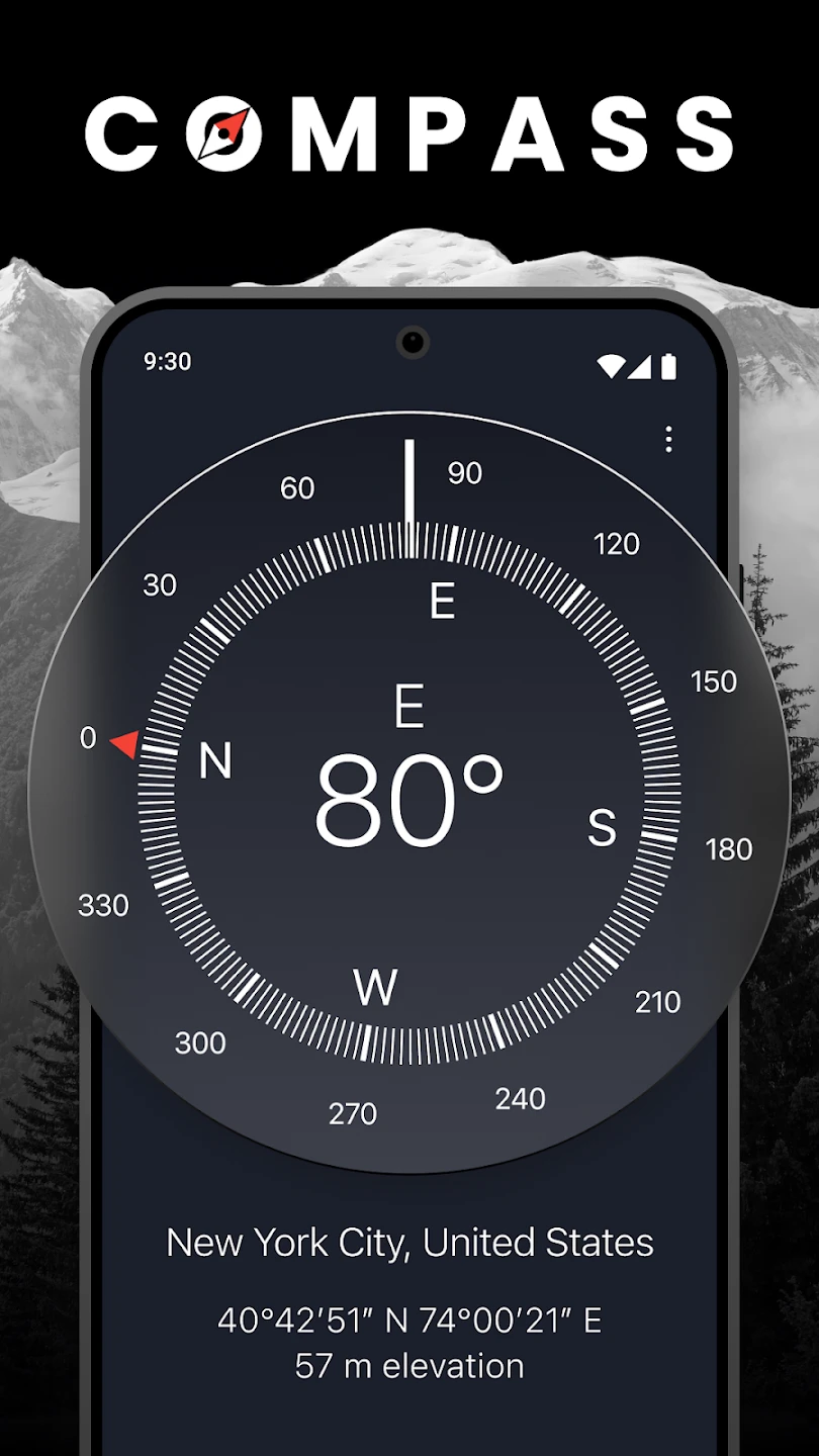 • Augmented Reality Mode: Superimposes a digital compass overlay onto your camera view, visually indicating direction with just a glance. This revolutionary feature makes orientation instantly intuitive, eliminating the need for constant screen checking.