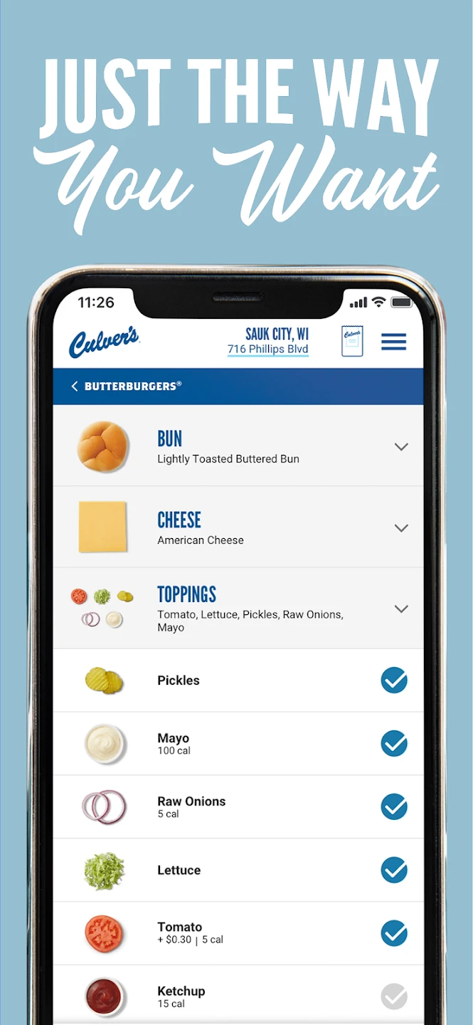 Offers extensive customization options, drive-thru functionality, and a robust loyalty program with points for discounts. Includes food ordering and payment features similar to Culver’s, focusing on quick service and value. |