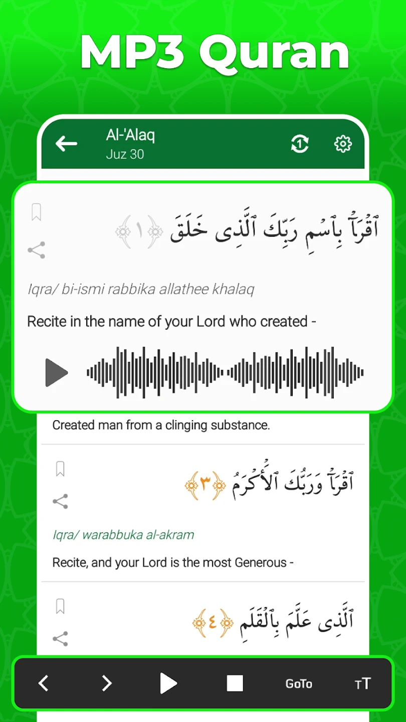 • Multilingual Verse Display: View Arabic text alongside translations and transliterations in your preferred language with customizable font sizes for comfortable reading, enhancing comprehension for beginners while preserving the original text.