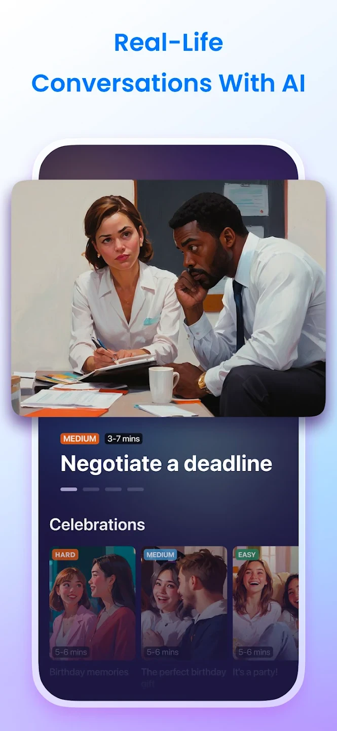 • Conversation Practice Scenarios: Access a variety of pre-made conversation topics and scripts covering common real-life situations like ordering food, discussing hobbies, or giving opinions. Users can practice speaking naturally by recording themselves while following these scenarios, preparing them for actual interactions and building confidence in different contexts.