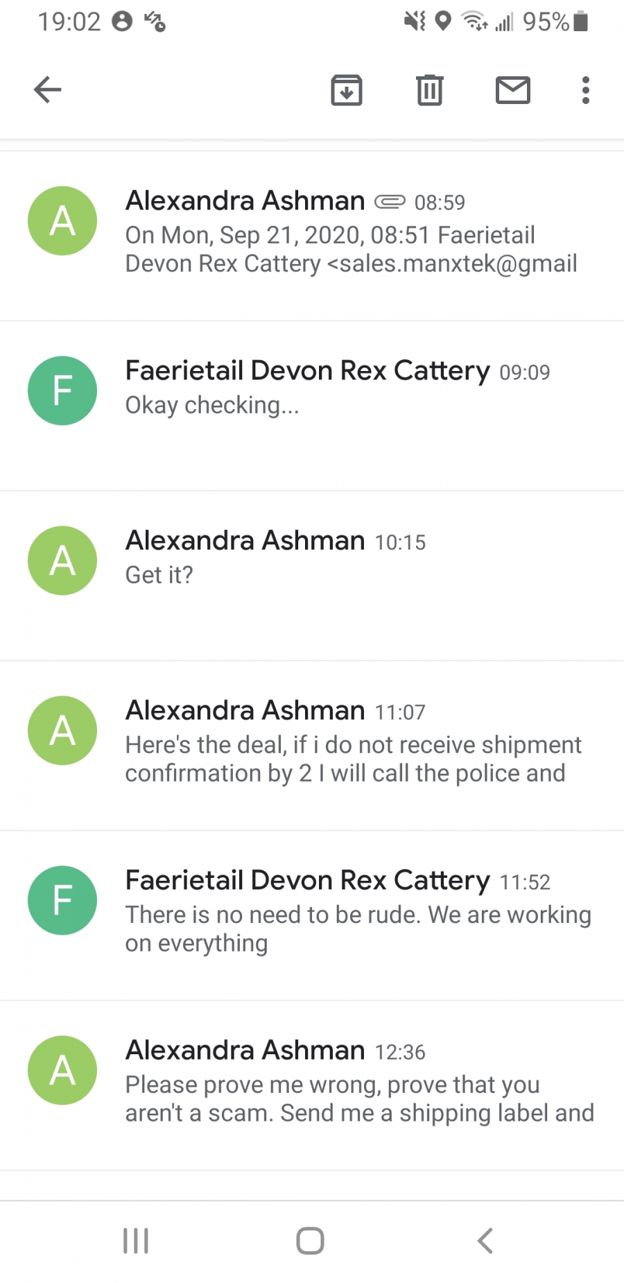 We purchased a Devon Rex kitten that showed as available on the cattery website. The $850 cost of the kitten and delivery fees were paid on Sunday, September 13, 2020. The original commitment was to ship the kitten in a safe manner for delivery on Tuesday, September 15, 2020, at approximately 10:30AM. There have been numerous communications and delays that have resulted in the kitten we select not being delivered. In addition to the shipping company continuing to ask for additional monies for a climate-controlled carrier, insurance, and a document to prove that we are allowed to adopt an animal out of state. They have blocked my cell phone and are not replying to e-mail messages. The shipping company has indicated that the kitten is being detained in Chicago, Illinois, unless the fee for the city permit $1800 is paid. The rationale that they are providing is "due to pet overpopulation and kitten mills in the state of MA, no one is authorized to adopt or purchase pets out of the state of MA without a city permit which your kitten does not currently have and is being detained." The kitten is not located in Massachusetts and we do not live in Massachusetts. The breeder is not actively engaging with the shipping company to resolve the issues. They made all shipping arrangements, not us. Delivery has been delayed three times… and they have stopped all communications with us, except to continually ask or varying amounts of money to solve obscure problems. Nobody is telling us if the kitten is being cared for or safeguarded. The breeder has also stopped all commutations with us. He blocked my number and is not replaying to e-mail communications.