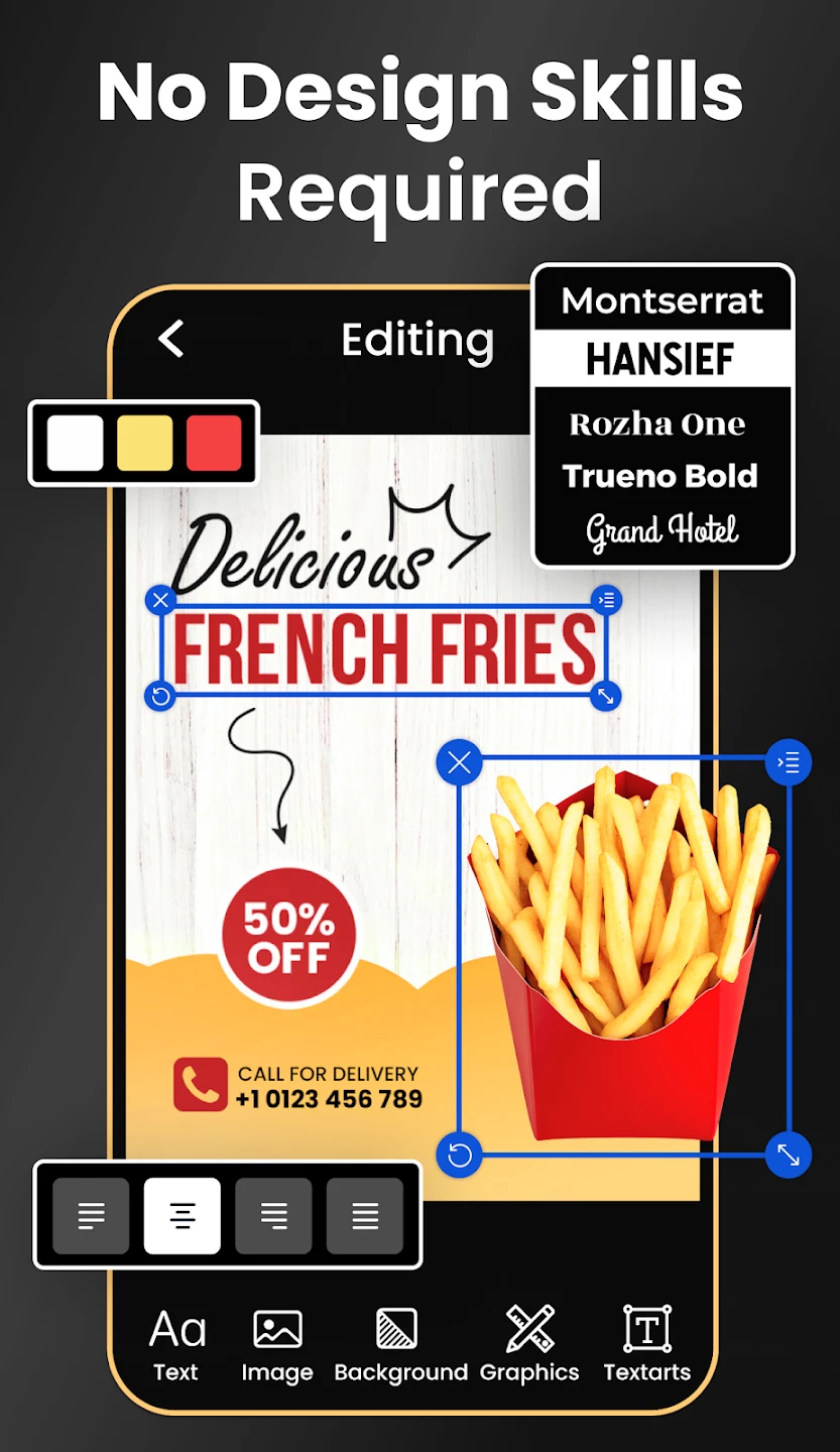 • Advanced Customization Tools: Modify colors, fonts, effects (like shadows, gradients), borders, and text properties with a comprehensive set of tools. This empowers users to refine every detail until their design is precisely the look and feel they envisioned, ensuring flyers stand out with a unique identity.