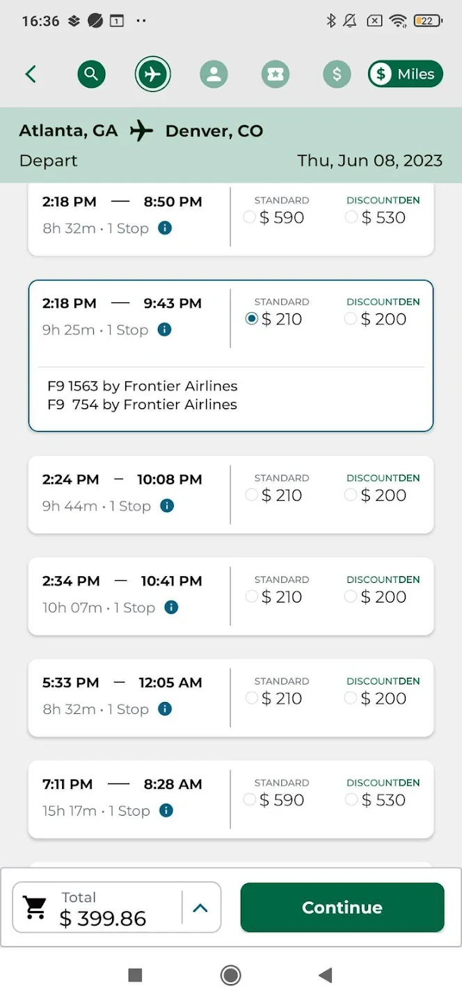 Users can access their Frontier Miles account directly in the app to earn, view, and redeem miles. All payment methods, vouchers, and loyalty points are stored in the digital Travel Wallet for quick access during bookings or upgrades.