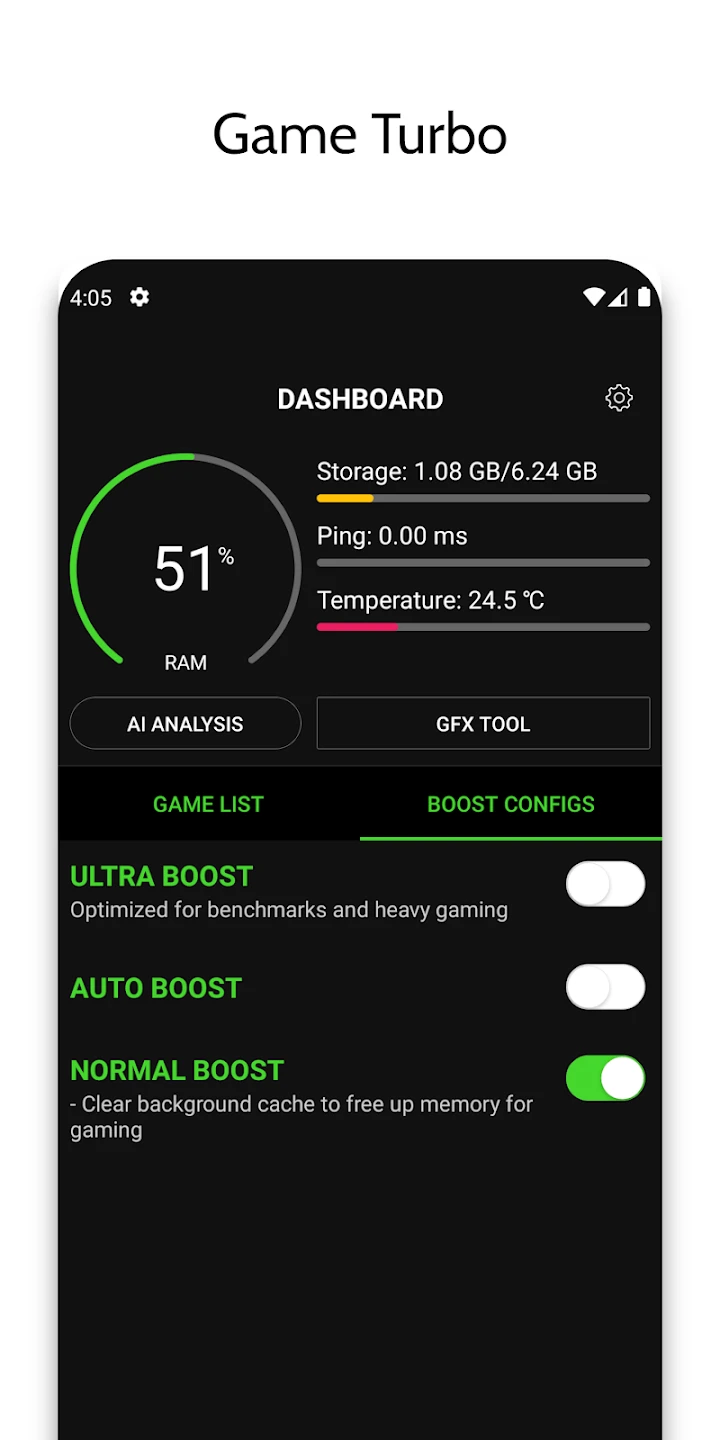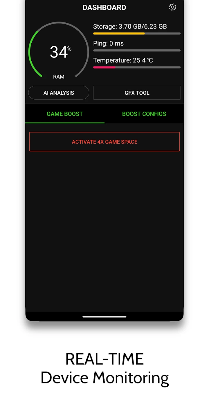 - One-Tap Performance Boost: Instantly optimizes your device’s CPU, RAM, and network settings specifically for gaming. This feature eliminates manual adjustments, letting you focus solely on gameplay without performance-hogging apps interfering.