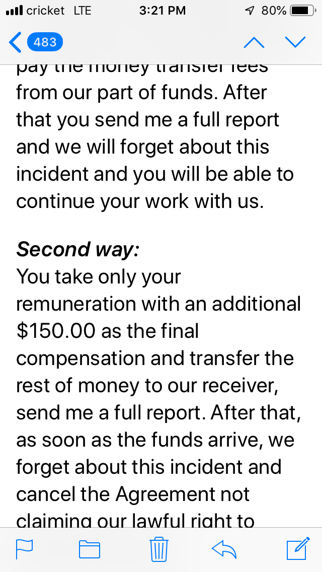 Stupid enough to believe I had a job. Maria Santini was my supposed supervisor. I can’t believe I bought into her bs. Deposited a check and now it’s flagged and I’m going to have a lovely overdraft. She had told me that her company was expanding to the us and was opening a place in my state.