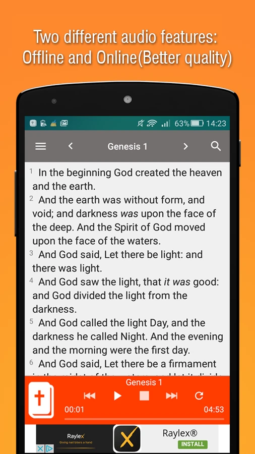 - Complete Offline Content: Instantly access the entire King James Version without downloads or data usage. This eliminates interruptions, letting you read during commutes or in locations with limited access.