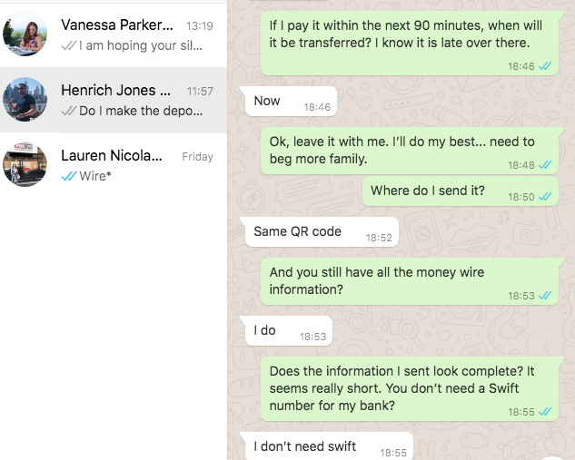 I then continue to explain to Vanessa that this is very suspicious and once again very secretive which caused doubt. Also, that paying it will be very difficult. Vanessa is so kind as to offer to help with paying for 50% but I would still need to come up 1,250 USD before earning can be sent.