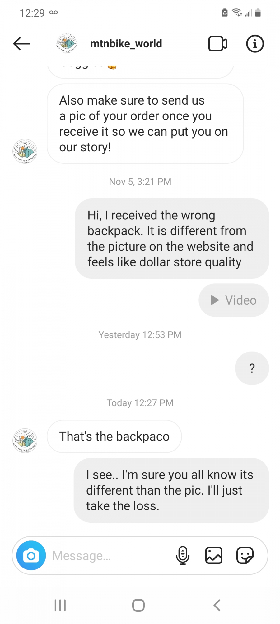 The same EXACT thing happened to me. I reached out to them saying this is NOT the backpack worth 100 dollars that I bought online.. they simply replied “thats the backpack”. I didn’t even know what it was when it arrived because it was rolled up into a bag the size of my palm. So disheartening. Suddenly all their posts are gone from their IG @mtnbike_world . Im not sure if this is related?