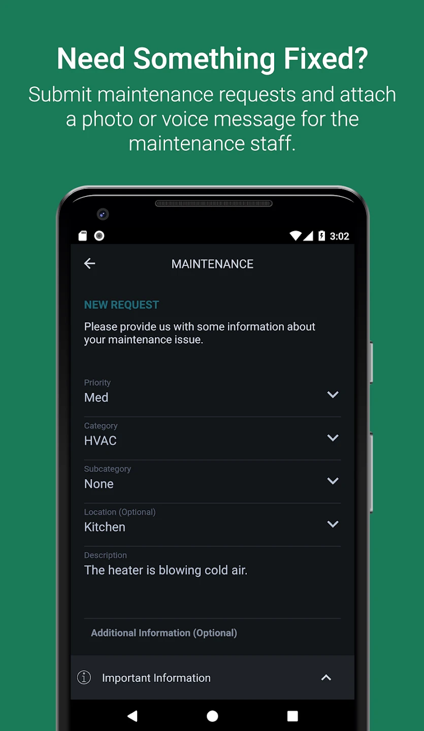 A: Launch the RentCafe Resident app, navigate to the ‘Maintenance’ section, tap ‘New Request,’ select the issue type, provide a clear description, add photos if helpful, and submit the request. You’ll receive an auto-reply confirmation and updates directly within the app.