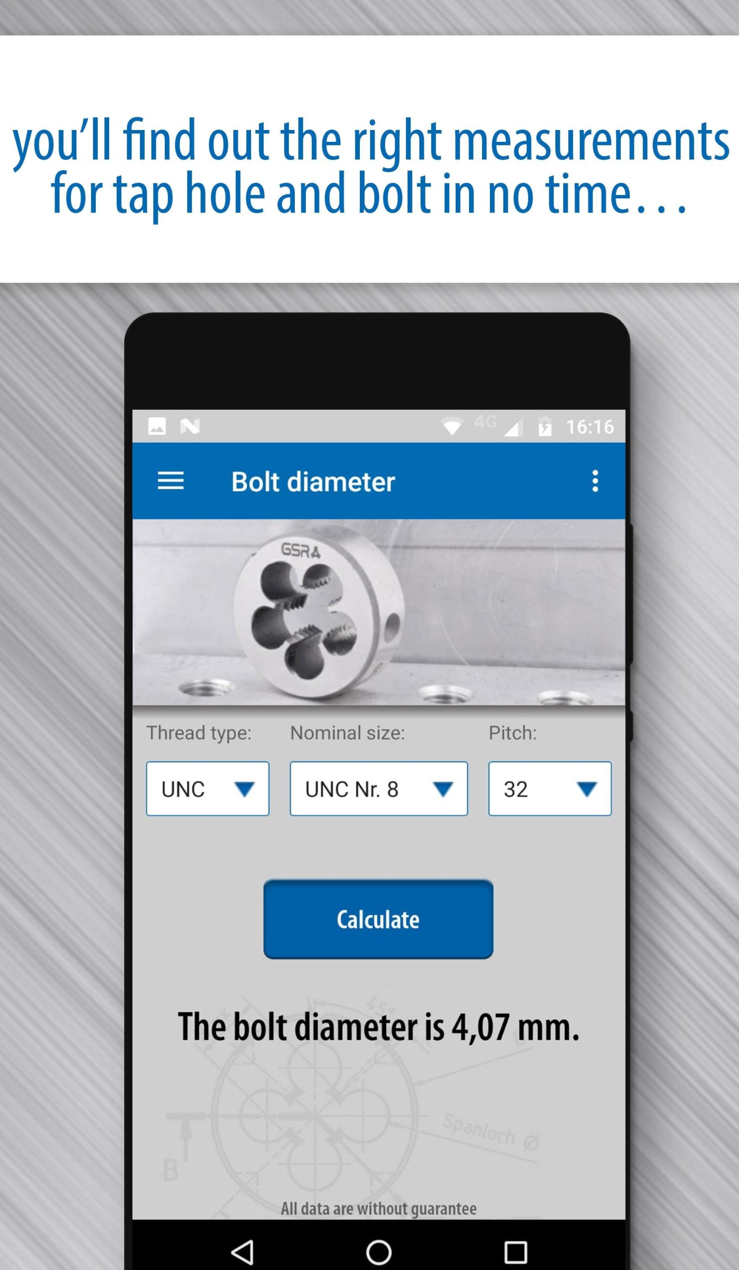 - Convenience and Portability: The Thread Calculator App provides the convenience of a compact and portable tool. Instead of carrying around bulky reference manuals or relying on complex formulas, users can access thread measurements and calculations directly from their mobile devices. This portability makes the app a valuable resource for professionals working in the field or on-site.