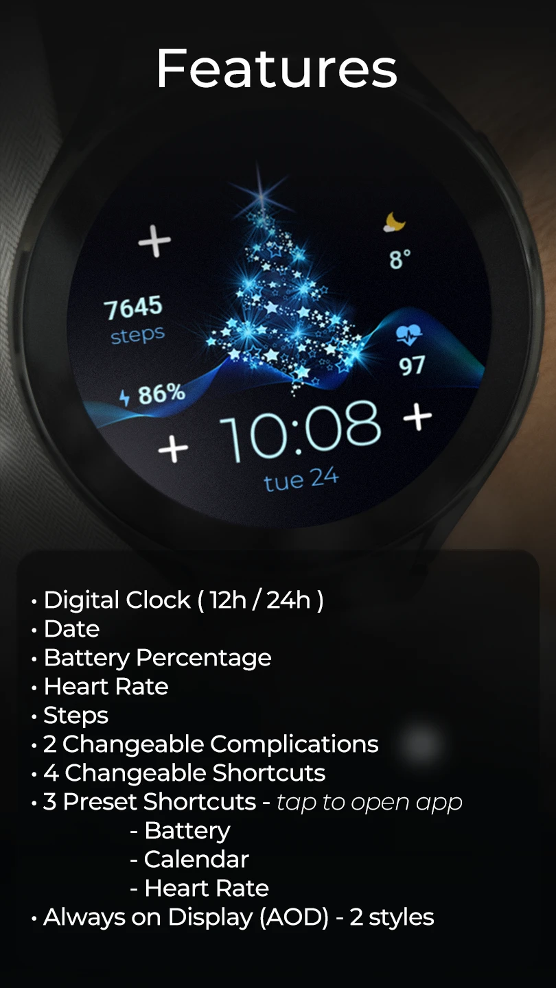 Designed for Wear OS. Includes a selection of animated holiday faces with easy swapping capabilities and sleek animations. |