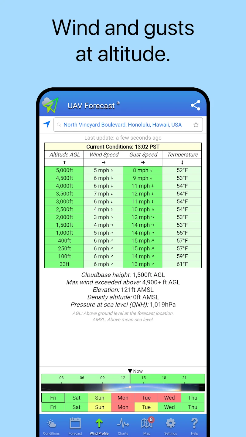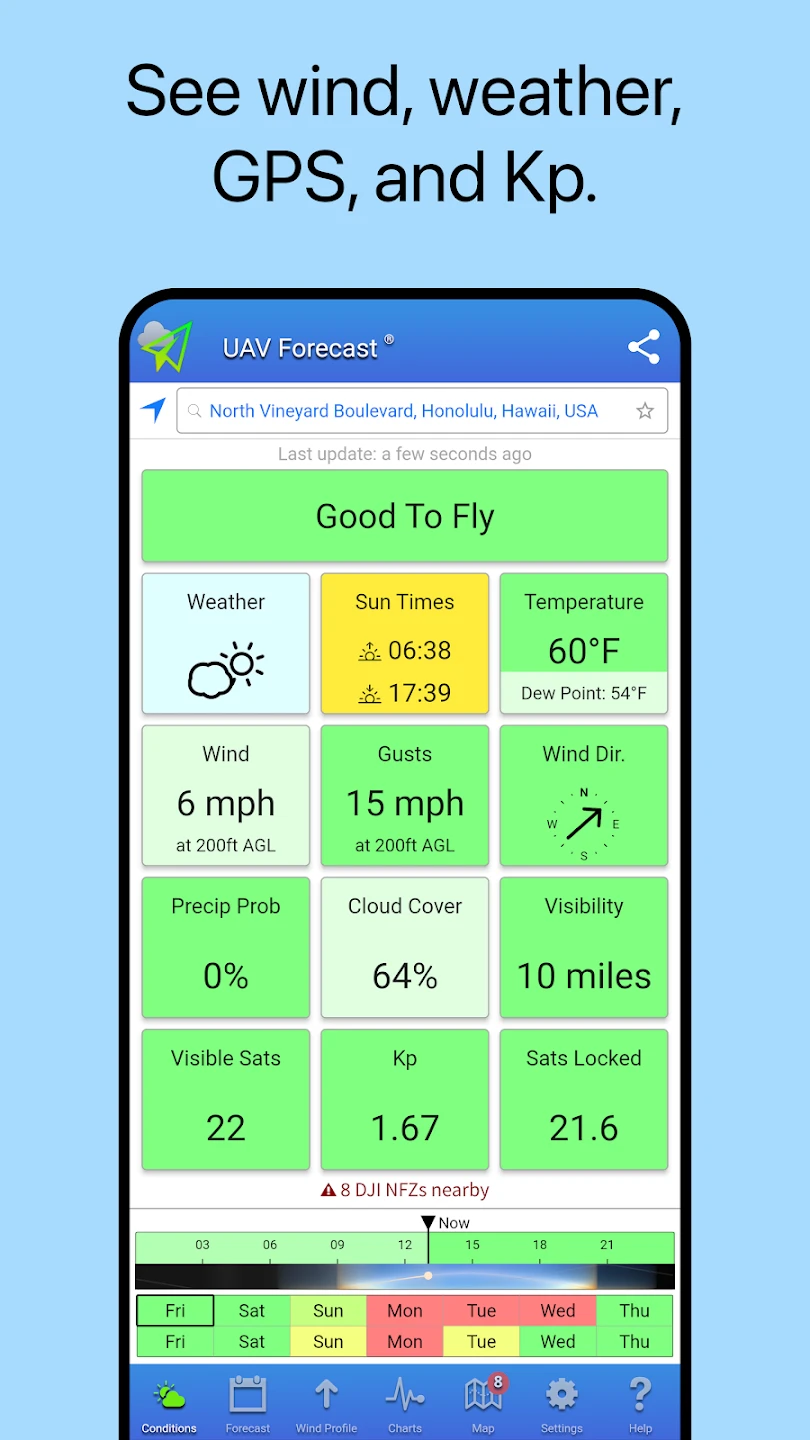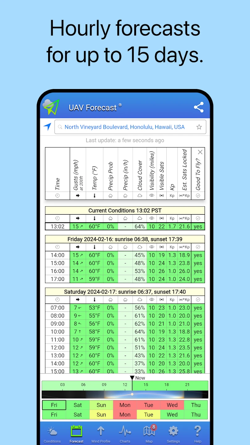 - Real-time Weather Data & Detailed Forecasts: Get up-to-the-minute information including temperature, humidity, wind speed and direction, precipitation probability, cloud cover, and visibility. This helps determine if flying conditions are suitable at a specific time and location, preventing flight attempts in unsafe weather. Better planning starts with accurate, current data.