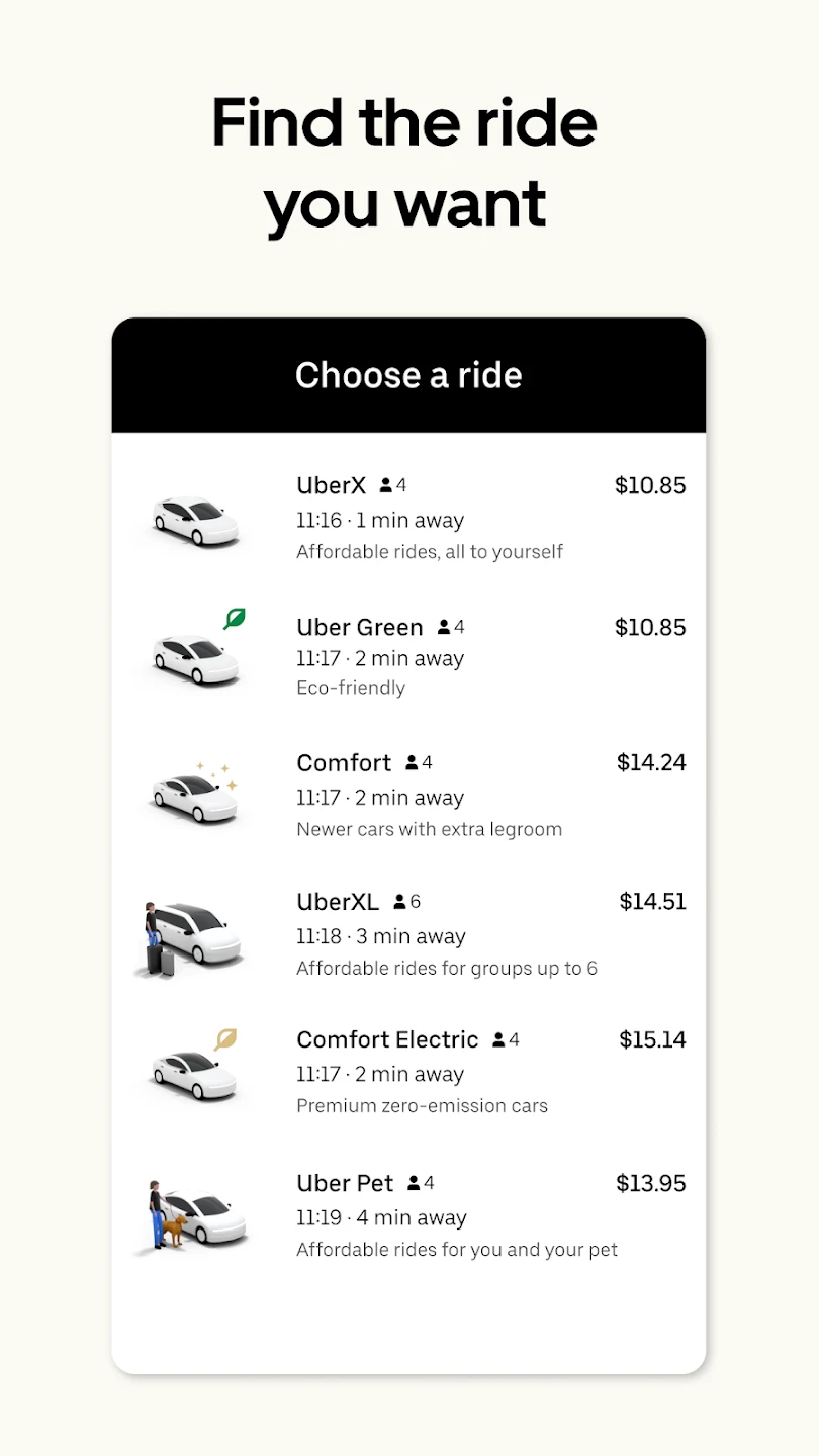 - Pre-Paid Fare & Secure Payment: Fare estimates are calculated automatically based on the route using real-time pricing. After requesting the ride, the fare is securely charged to a saved payment method, streamlining the payment process compared to paying with cash or a card at the end of the trip, thus reducing friction.