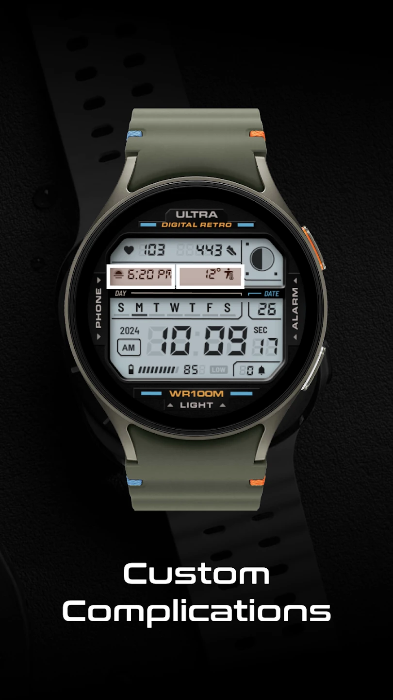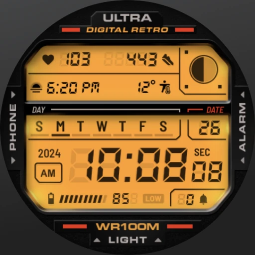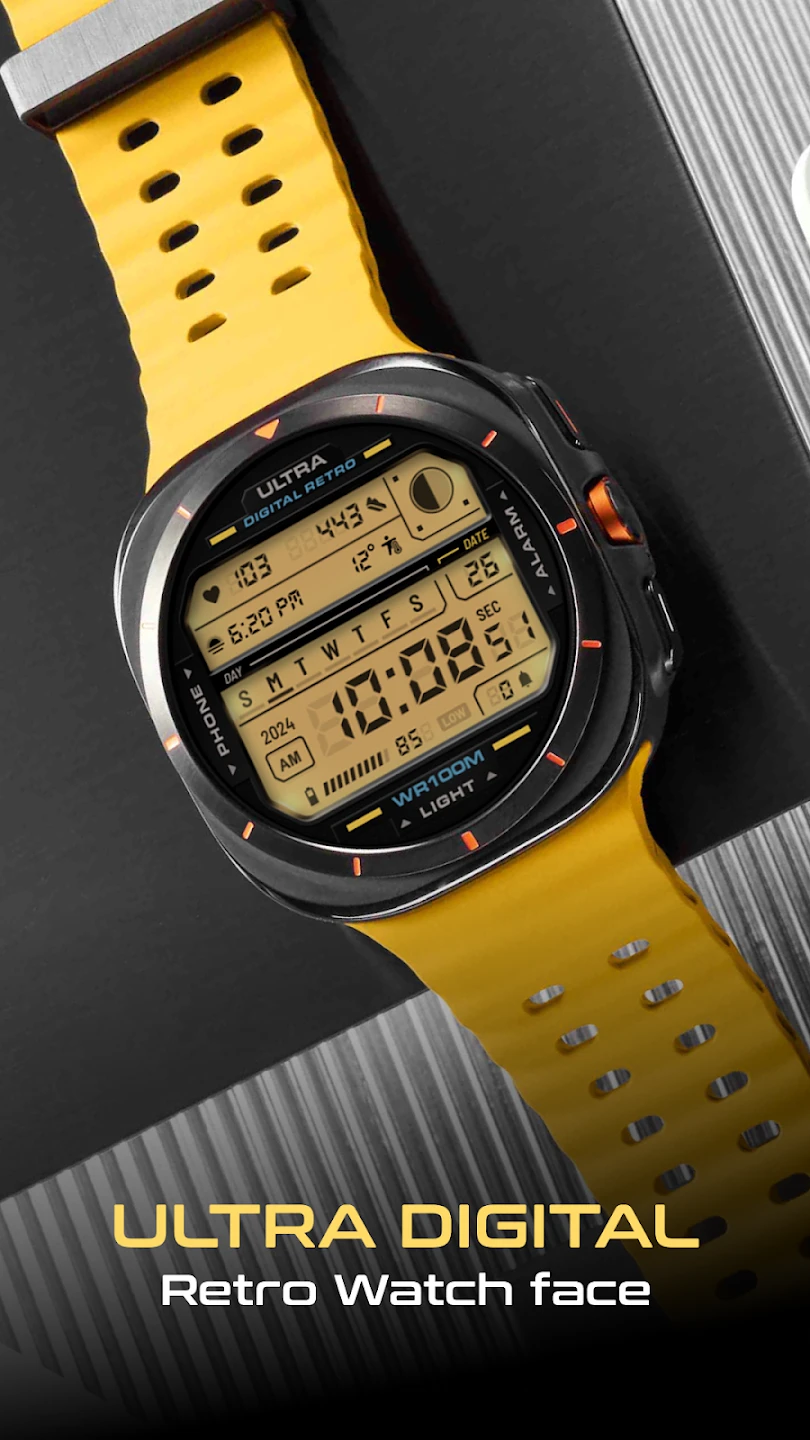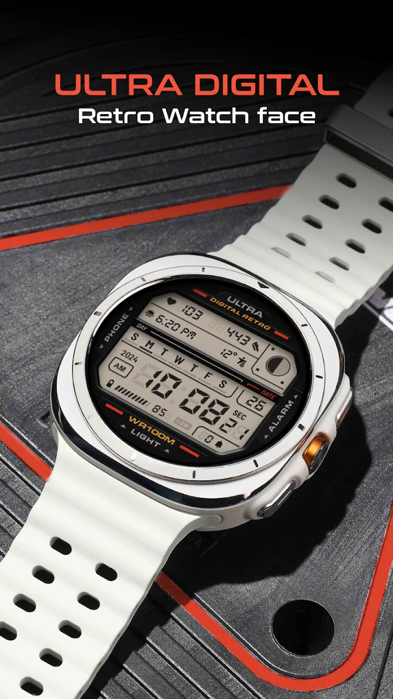 - Compatibility & Style Flexibility: This ULTRA Digital Retro watch face is designed to work with various popular smartwatch platforms, offering its distinctive style to a wide range of users. The flexibility allows individuals with different watch brands to experience the nostalgia and smart features, making it a versatile choice for diverse preferences.
