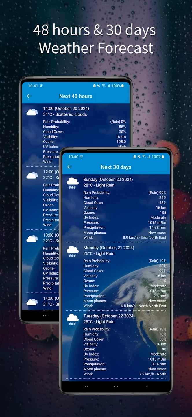 • Multi-Day Forecast: While focused on radar maps, the app also provides 7-day predictions showing storm paths, temperature shifts, and precipitation probabilities. This flexibility makes it useful for both immediate planning needs and longer-term travel preparations.