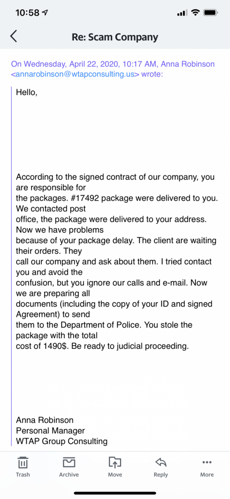 Got an email from Anna about this great job where I make $3,000 a month base pay to just ship things from my house that they send me. The names on the packages aren’t my name, and then I ship them to someone else which doesn’t have my name either. They needed my ID for proof age and address. They asked me how I want to get paid, I told them PayPal (seemed safer) so I email her the email I use for that.