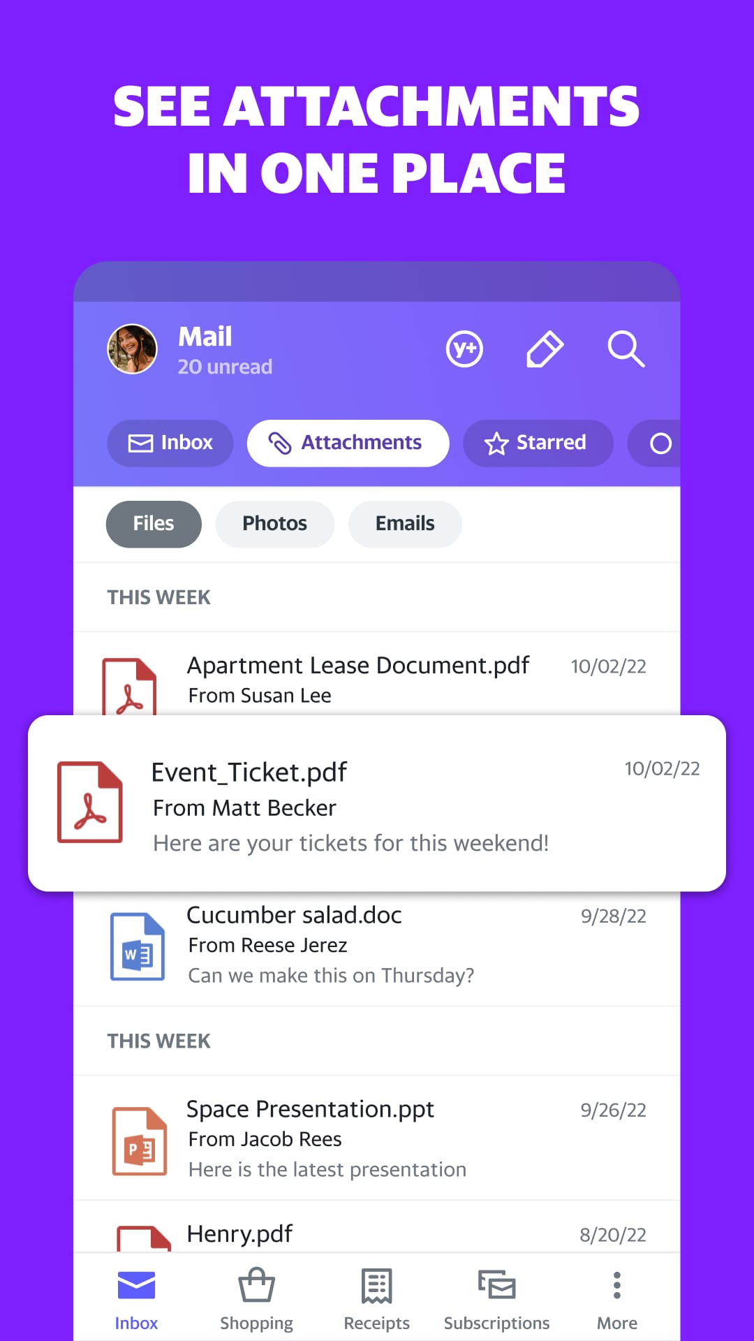 - Attachment Management: The Yahoo Mail app simplifies the process of managing email attachments. You can preview documents, photos, and videos directly within the app, eliminating the need to download files to your device. Additionally, the app provides cloud storage integration, allowing you to save attachments to your preferred cloud storage service, such as Dropbox or Google Drive, for easy access and sharing.